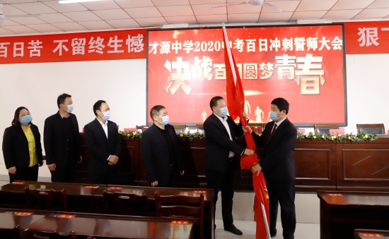 誓师大会现场,才源中学校长张醒民向九年级阶段负责人授战旗。师生代表面对直播镜头向全体初三师生发出铿锵誓言,号召大家奋勇争雄,2020年再夺中考全市领先的佳绩。誓词为:凌志擎天,豪气满怀;天道酬勤,乐战不怠;意坚心恒,信念常在;以我雄心,征战未来;冲刺百日,只为无悔青春;人生绽放,定是风雨兼程;今日苦读书厉兵秣马,明朝进重点吐气扬眉。