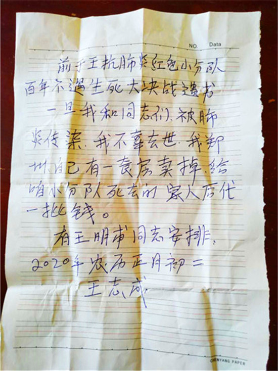 初二晚上,他是边哭边写下遗书。他说,病毒传染,看不见摸不着,也不知道谁携带?更不知道明天大家是个什么情况,既然动员大家冲到抗疫一线,战死了,他的家人咋办?他说,他在郑州有一处房产是养老用的,他害怕自己不幸感染去世了,没人照顾小分队战死的家人生活,随写下遗书,如果出现这种情况,将他的房产卖掉,分给抗疫战死的队员家人。
