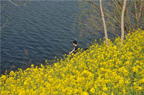 3月23日,市民在商水县邓城镇沙河葫芦湾水利枢纽附近欣赏油菜花。