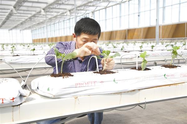 3月23日,项城市丁集镇一玻璃温室内,技术人员正在管理黄瓜幼苗。近年来,项城市积极推进农业供给侧结构性改革,加快推进高标准农田建设,有力促进了农业增效农民增收,让乡村更加美丽,让农民更加富足,让农业更有竞争力。张永久 摄