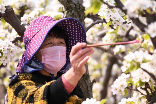 泛区农场的万亩果园不仅吸引着游客观光游览,而且盛产的桃、梨、苹果,品质好,味道好,吸引着商家订购,为果农带来可观的经济收入。目前,给梨花授粉是果农在花期中最重要的工作,上图为果农正紧张地给梨花授粉。