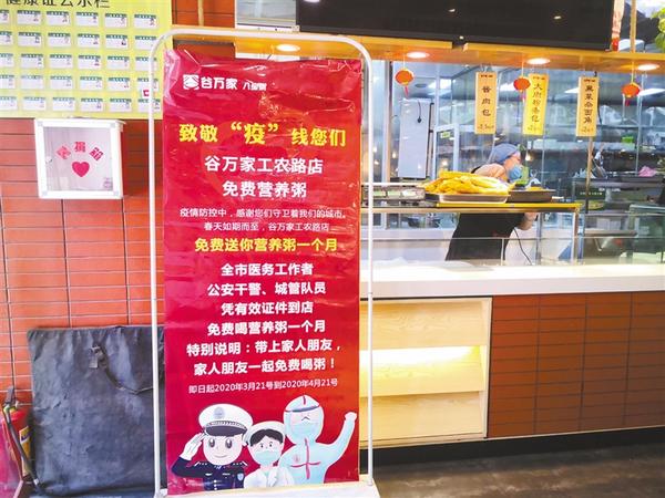 本报讯 3月23日,记者在位于中心城区工农路南段的谷万家饭店发现,该饭店入口处摆放着一个易拉宝展架(如图),内容是“全市医务工作者、公安干警、城管队员凭有效证件到店免费喝粥一个月”。