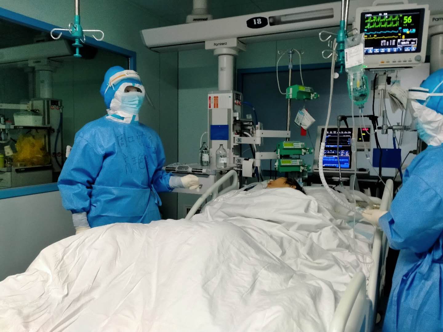 高艳艳说,除了多穿一层防护服,其他的跟平时的工作差不多。不同的地方,主要体现为两点,一就是从接班到交班,所做的所有工作都多了一份被感染的风险。二就是救治存在的难点多、棘手的问题多、突发事件比较多,比如说:新冠肺炎患者发展到危重期,特别是病程较长的病人,肺大多烂掉了,多数病人上有呼吸机,这样的病人极易出现气胸。有一次值班期间,一位56岁的男性患者,突发氧分压下降、烦躁、血压下降、出汗,急查胸片证实气胸,紧急给予了胸腔穿刺闭式引流,病人症状才得以缓解。气胸虽然在临床上很常见,但对于新冠肺炎病人却如同雪上加霜,不紧急处理病人很快就会死掉。每一个抢救的场面如同一场激烈的战场,而战斗随时会打响,但你却根本无法预测哪一次战斗会在哪一个时刻打响,所以值班时每位医师都会惯性地紧盯着每个数值、各个参数……