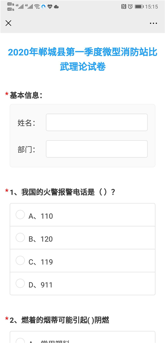 线上理论答题环节,在郸城消防公众号上开通网络答题平台,选取与平时工作、生活联系紧密的消防安全常识设置为题目,在线理论测试不受地点限制,既提高社会单位员工的参与度,又使大家学到了有用的消防知识。