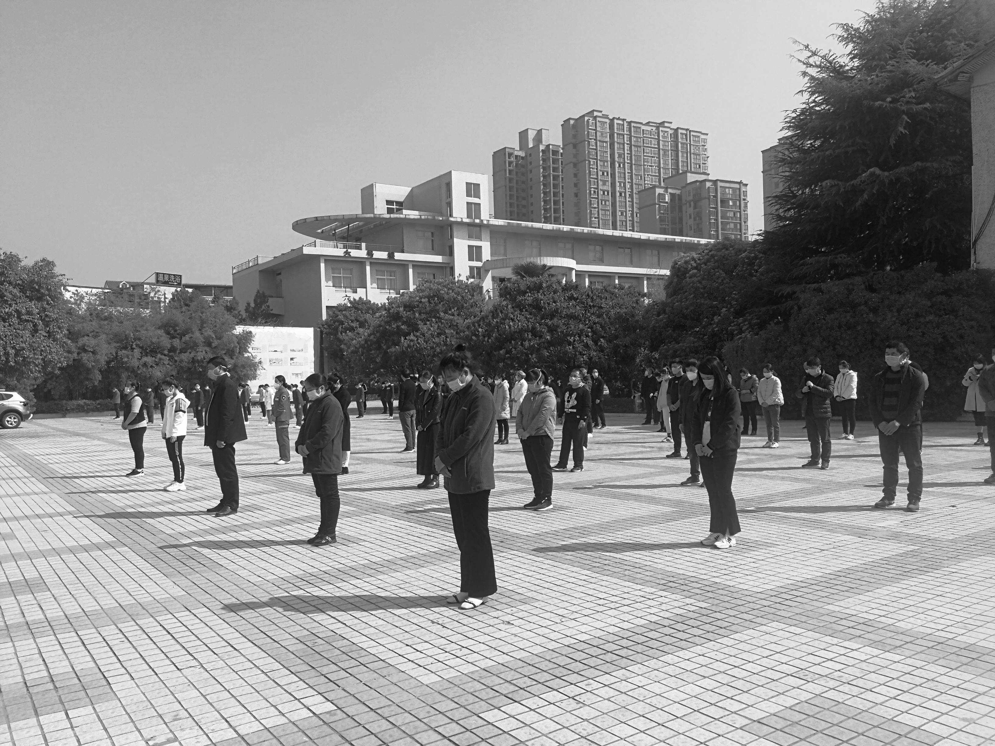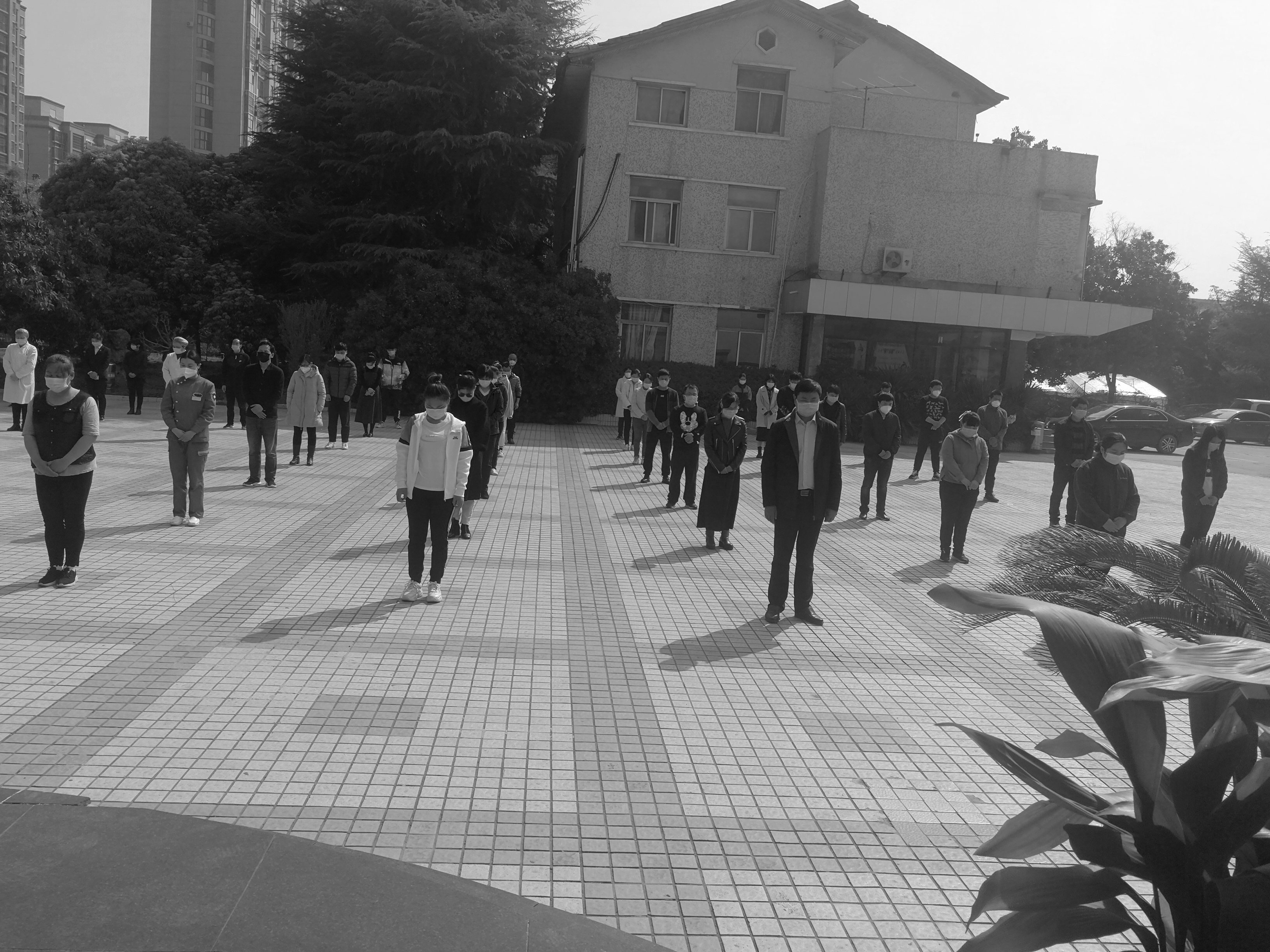 4月4日上午10:00整,防空警报声响起。在周口迎宾馆援鄂医疗队休整驻地,我市援鄂医疗队队员们站在院内楼前空地上神情肃穆,低头静立默哀三分钟,悼念在抗击新冠肺炎疫情斗争中牺牲烈士和逝世同胞。