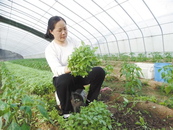 4月6日,沈丘县周营镇一现代农业科技示范基地内春意盎然,菜农正在大棚里采摘新鲜的大叶荆芥。该基地采取“龙头企业+合作社+基地+种植户”的运作和管理模式,带动周边120余户农民发展生态瓜果蔬菜订单种植业,经济效益可观。谢辛凌 摄