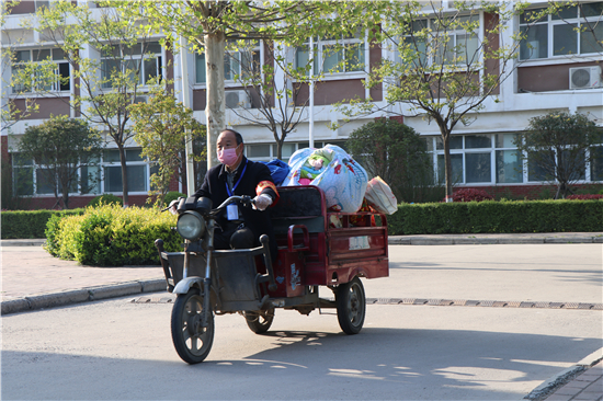 4月7日,郸城高三年级复学首日。当天,郸城一高校园内,一个个头不高、年龄五十出头的大叔,骑着三轮“座骑”穿梭校园搬运学生行李,花白的头发随风飘舞,成为校园一道靓丽的风景。