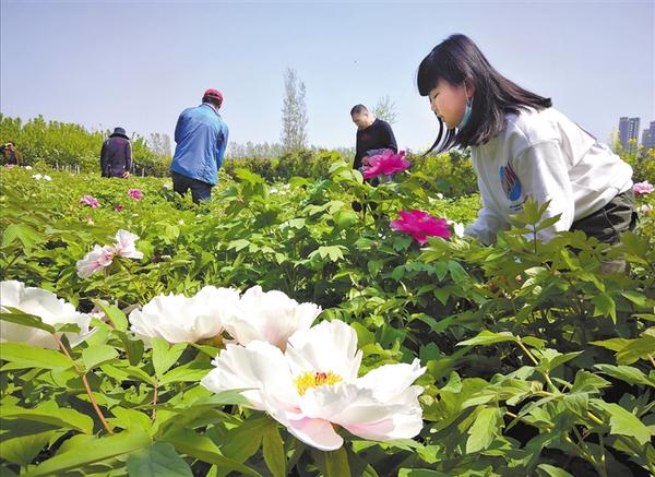 图二 4月7日,在周口经济开发区淮河路办事处小牛庄的一个花圃内,千余株牡丹相继吐蕊,吸引不少市民前来赏花。近年来,我市不断对中心城区进行改建,着力提升城市的园林绿化水平,切实激发了城区周边农民种植花卉、草木的热情。 记者 孙安平 摄