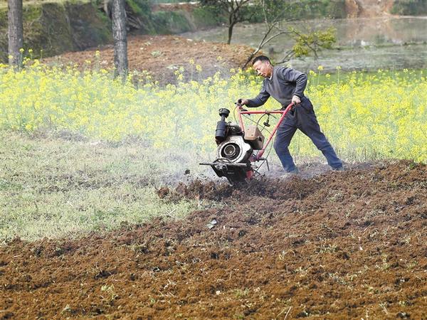 图三 昨日,沈丘县卞路口乡一农民正在用小型农机犁地。连日来,气温不断回升,当地农民抢抓有利时机,进行犁地、浇水、除草等春季管理,田间地头一派忙碌景象。 黄海涛 摄