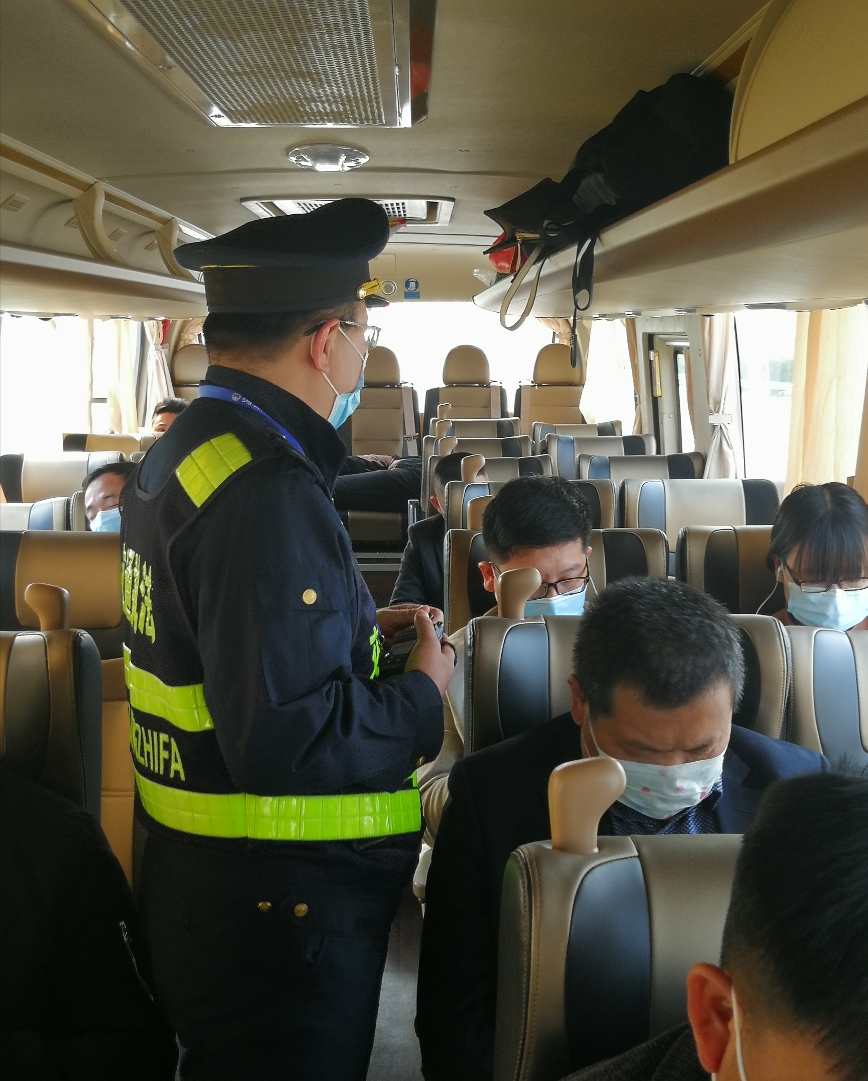 连日来,周口市交通运输局执法处在疫情防控工作中慎终如始、守土尽责,组织执法人员在高速公路收费站等地积极加强“健康码”推广使用的执法检查,宣讲使用‘健康码”的重要意义,耐心指导部分乘客下载填写,让一些不能熟练使用智能手机的乘客也有了健康出行的“身份证”。在全力织密交通“战疫”防护网的同时,把一个个车厢变成了周口交通执法人规范执法、文明服务的平台。图为4月9日,该处高速一大队执法人员正在安罗高速公路周口西站一辆客车内开展“健康码”推广使用的执法检查和宣讲。