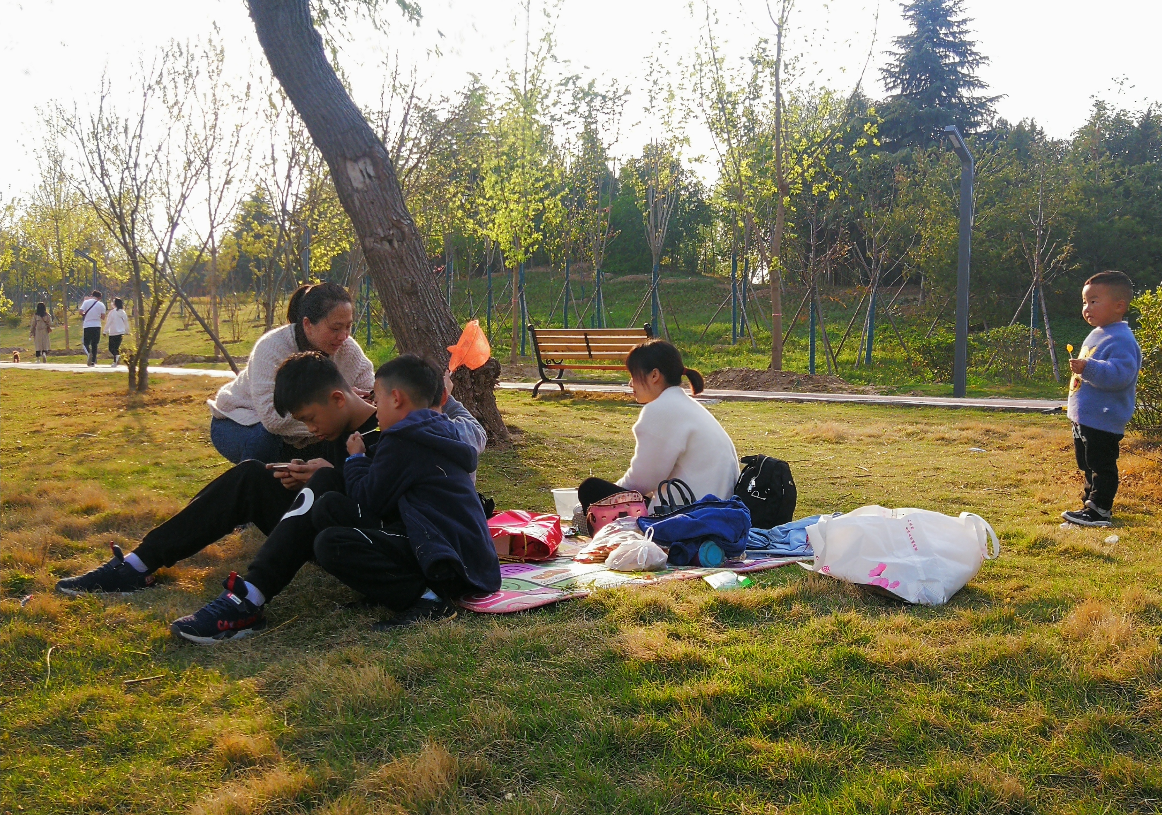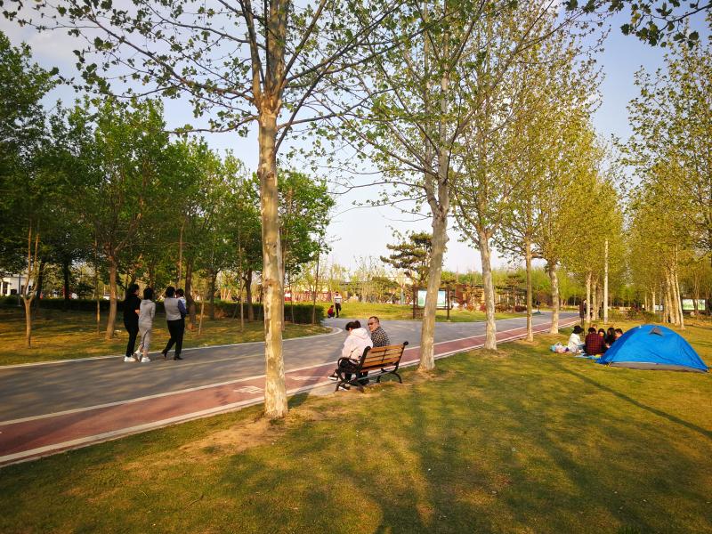 4月13日,周口植物园内游人如织,市民或三三两两健身散步,或聚在一起玩耍聊天,尽情享受绿树成荫、鸟语花香的舒适环境。