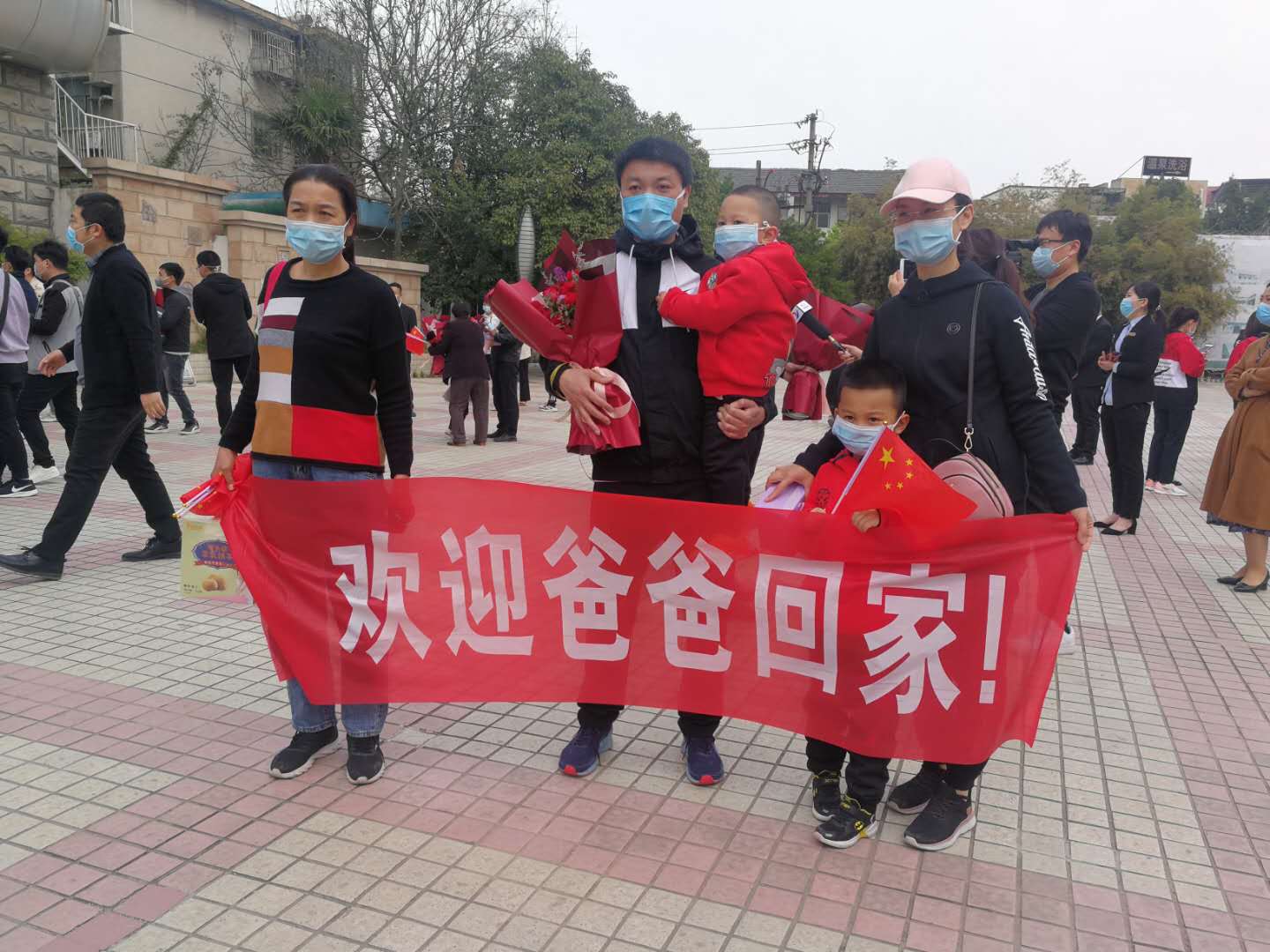 “欢迎爸爸回家”、“欢迎回家” 亲人们、同事们、朋友们和自发赶来的市民早早守候在隔离休整点门口,等着迎接英雄回家。一束束鲜花、一条条横幅都在向凯旋而来的勇士们表达着敬意和思念。