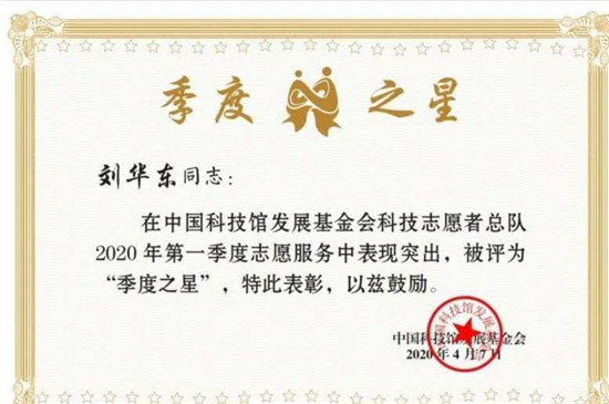 为进一步弘扬志愿服务精神,引领社会志愿服务新风尚,中国科技馆发展基金会面向已登记注册的志愿者,根据第一季度志愿服务活动记录,近日经审核、筛选,评选出3名优秀志愿者。淮阳中学青年教师刘华东成了河南省唯一受到表彰的优秀志愿者。