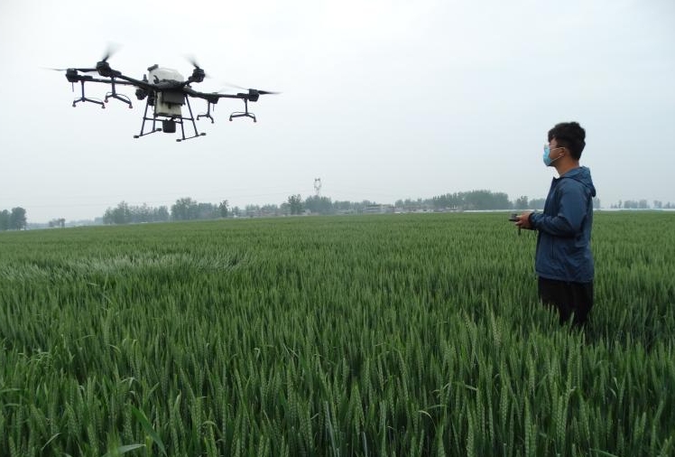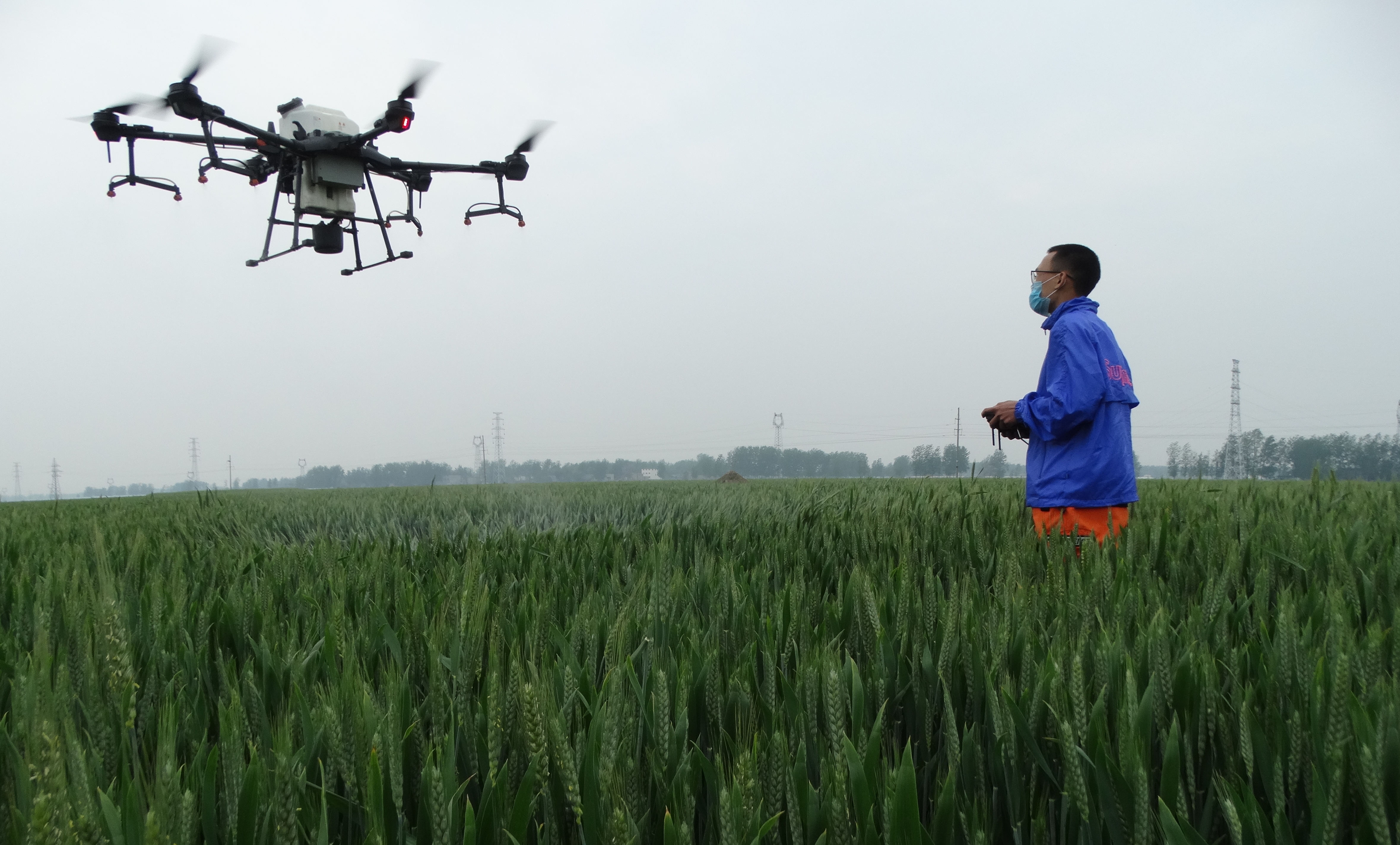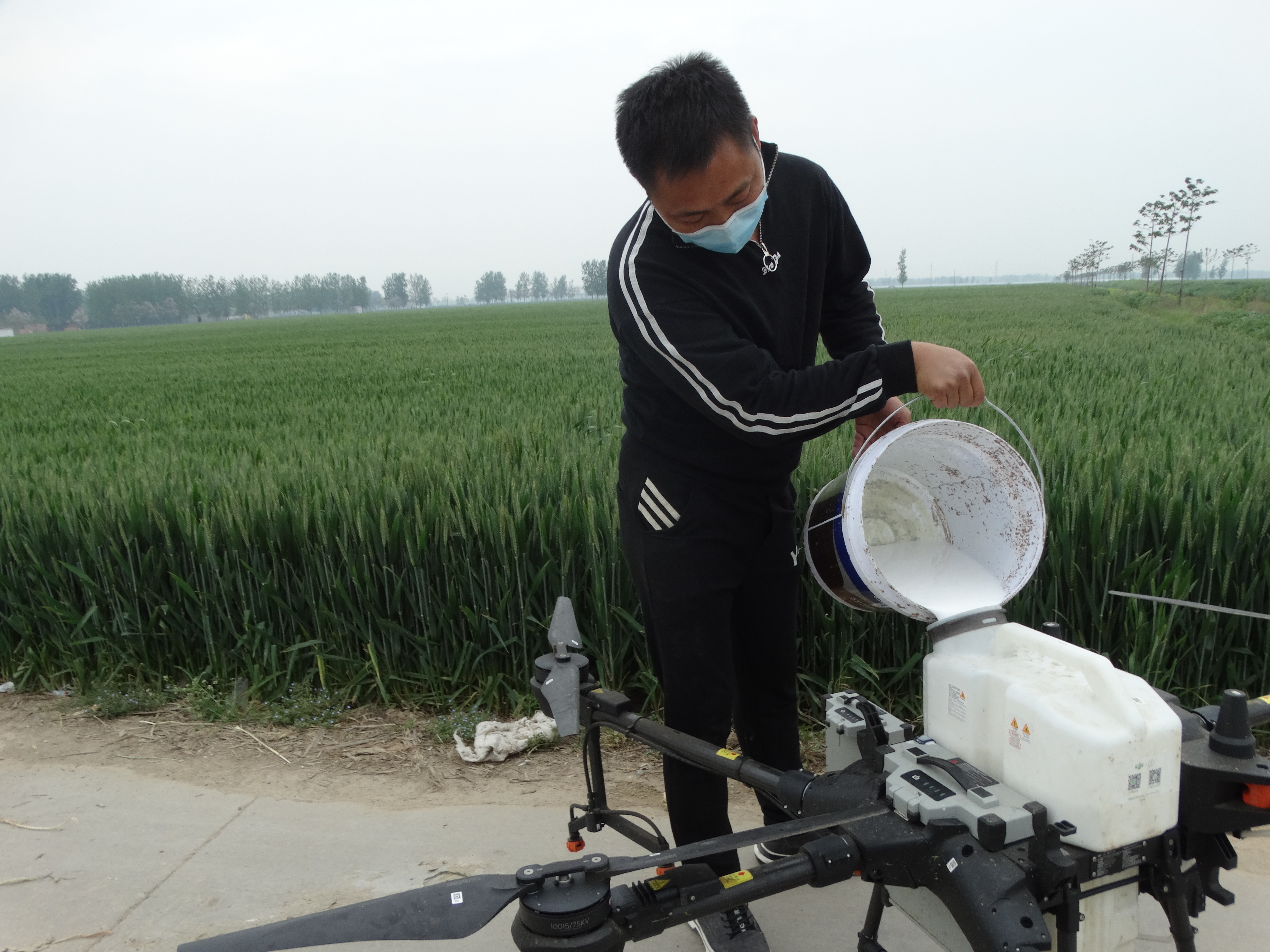 4月18日,沈丘县周营镇王寨村小麦高产示范基地,飞防技术人员在操作无人机进行“一喷多防”作业,喷施“防治病虫害+强筋壮骨增产营养液”套餐。