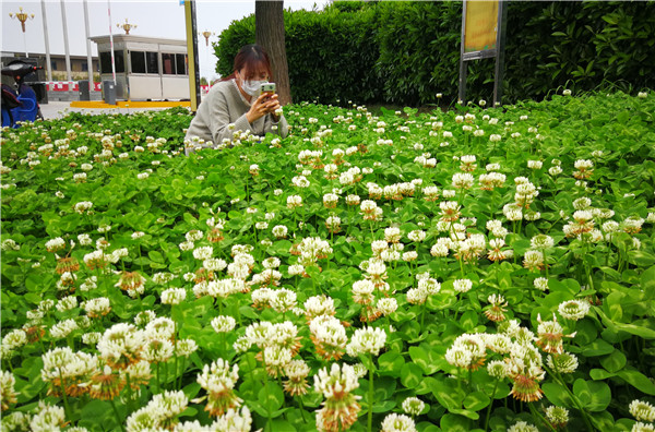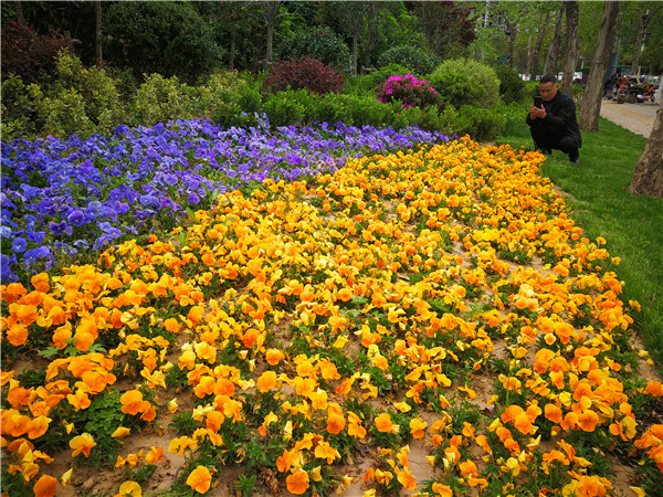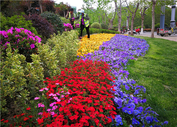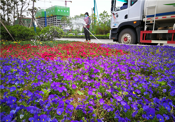 4月20日,在文昌大道道路绿化带上,市政工人正在为栽种的花卉绿植补充水分。入春以来,我市城区一直在进行美化绿化,现在各个街道逐渐显现出绚丽身姿。市民走在市区的每个街道都能看到各色花卉、绿植,很是养眼。