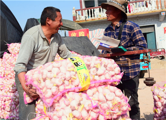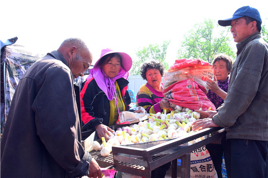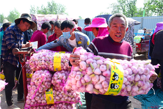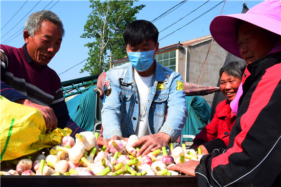 4月26日下午,记者在淮阳县王店乡107国道沿线看到,各个大蒜的收购点车来车往,蒜农们拉着新蒜卖给小贩们。尽管今年春季雨水较少,天旱土地墒情较差,但是上万亩大蒜,在蒜农们施肥浇水管理下,长势不错,每亩产量在3000斤到4000斤之间,迎来疫情下的大蒜丰收。
