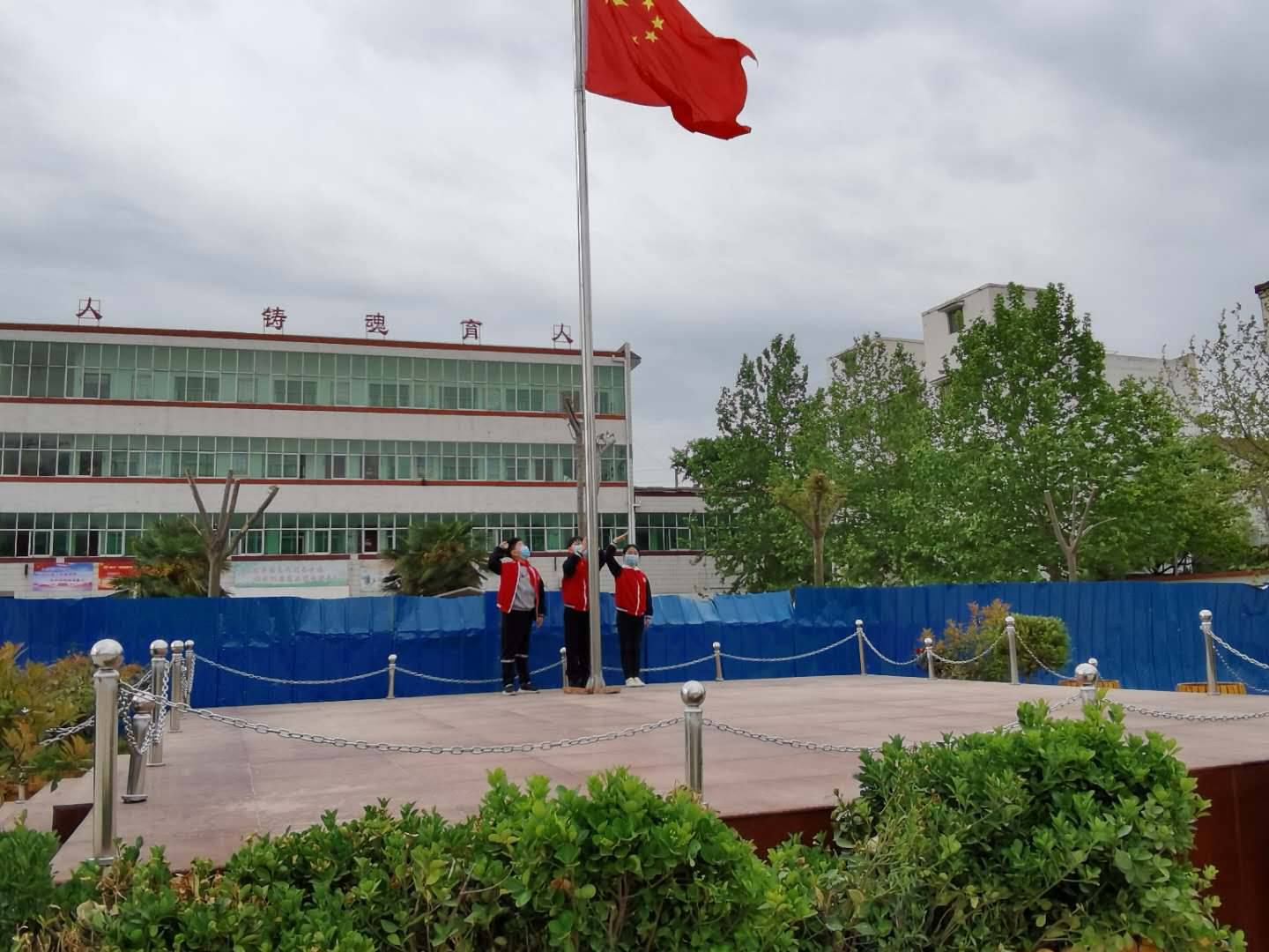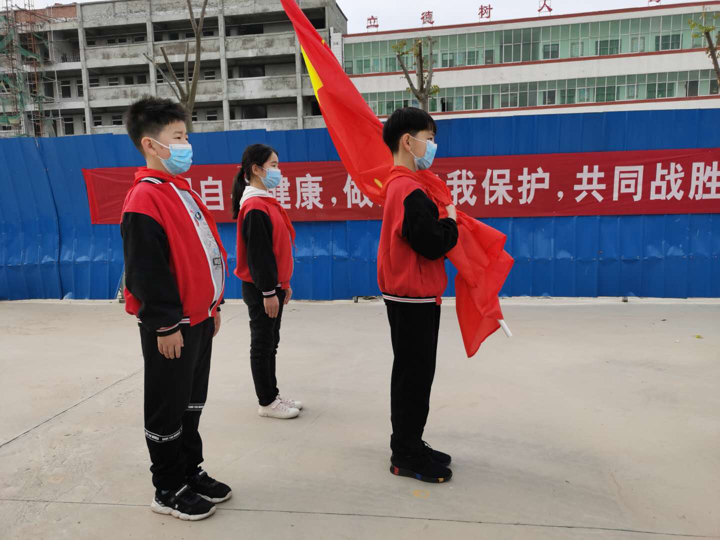 这是一次特殊的升国旗仪式,三名国旗手在操场上将五星红旗冉冉升起,升旗实况同步转播到教室内的电视屏幕上,同学们在各自教室里面向国旗庄严肃立、齐唱国歌,面向国旗敬礼,在国旗下立下一个志,将来成为一个对社会有贡献的人,能够为社会做出突出成绩的人。