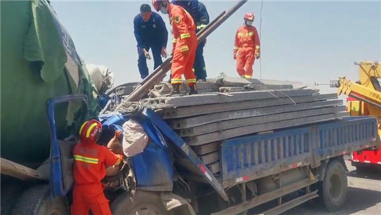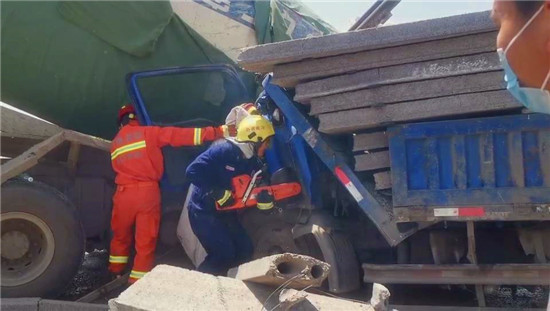 据了解,由于两车相撞产生的冲击力导致货车与水泥灌车的车体紧紧连在一起,货车驾驶员被卡在驾驶位上无法动弹。为了能尽快将被困司机救出来,现场指挥员指挥救援人员协助现场交警、路政部门立即对事故路段进行封锁处理,并设置安全员对过往车辆进行警示,保证救援工作正常开展。同时,另一组救援人员首先对压住驾驶室的石板进行清理,然后使用液压器材工具组进行破拆,并对驾驶员腿部被挤压部位进行扩张。经过十五分钟的紧急救援,被困司机被成功救出后移交现场救护车送往医院治疗。