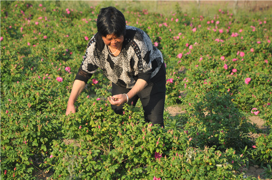 2015年,在昆明、郑州等地从事花卉经营销售十多年,积累了一定经验和资本的刘军停返乡流转土地种植药用玫瑰400多亩,目前已到采摘期。这些玫瑰经分拣、烘干等初加工后销售到南方某医药公司进行深加工,花农每亩可收入7000元左右。
