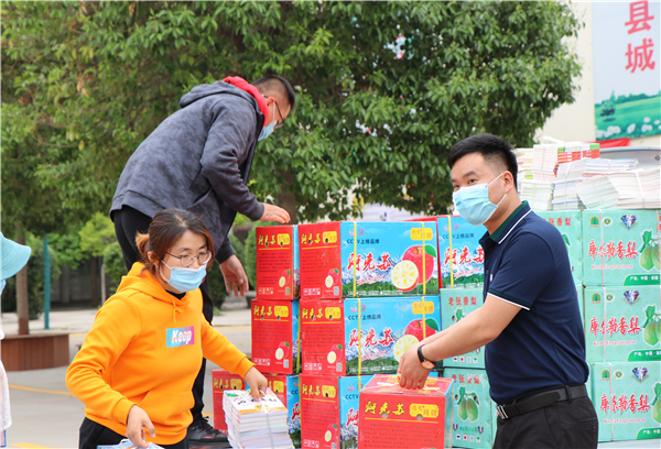 不久,一辆小货车驶入实验小学院内,满载着水果、毛巾、酒精、消毒液、洗手液和图书等物资,总计价值两万余元。吴玲玲跳下车,向迎上来的韩涛简单地打了招呼,便和学校工作人员一起把水果等物资卸载搬运。
