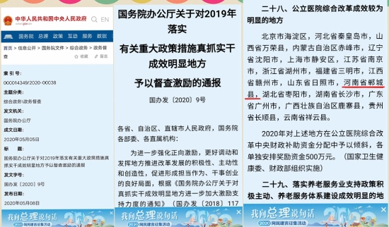 5月8日,中华人民共和国中央人民政府门户网站发布《国务院办公厅关于对2019年落实有关重大政策措施真抓实干成效明显地方予以督查激励的通报》国办发〔2020〕9号文件,对213个地方予以督查激励,相应采取30项奖励支持措施。其中,郸城县荣登“对公立医院综合改革成效较为明显的地方”名录,获奖500万元。