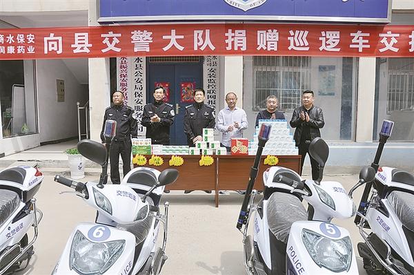 4月17日,商水县振兴保安公司和河南润康药业联合向商水县交警大队捐赠8辆两轮电动巡逻车和部分疫情防护用品。