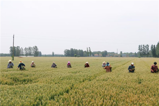 5月16日,记者在鹿邑县枣集农场看到,2800多亩的良种小麦繁育基地里50多人分成四支队伍一字排开,在绿波碧浪的小麦田里认真排查、进行提质去杂工作。