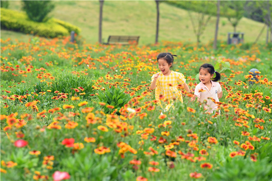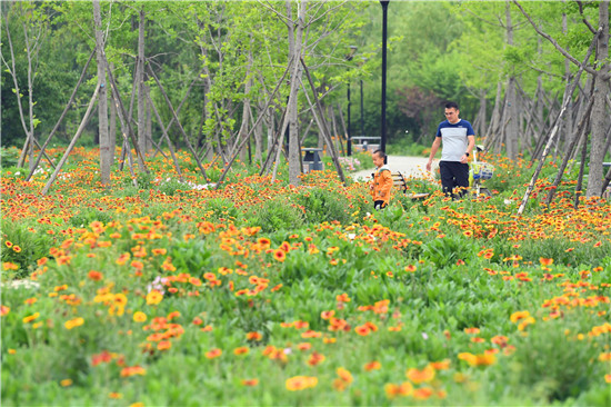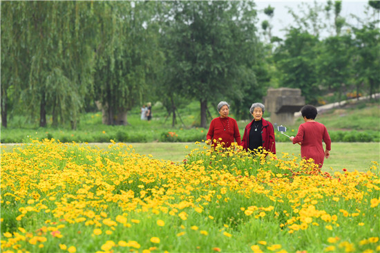 5月17日,市民徜徉在东方园林的花海中,畅享休闲乐趣。近期,位于沙颍河南岸的东方园林内,成片的天人菊等花卉相继盛开,犹如五彩的花海,不少市民来些游玩、拍照。