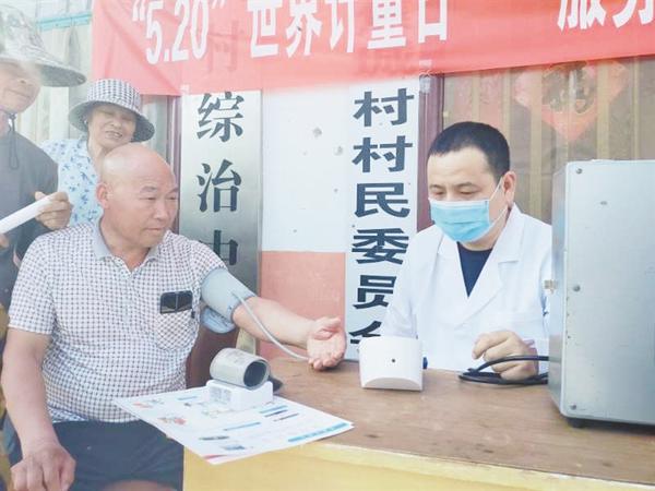 为庆祝“5·20”世界计量日,普及计量科学知识,加强计量宣传工作,5月19日下午,市市场监管局、市公共检验检测中心组织工作人员来到商水县谭庄镇焦城村开展服务计量进乡村活动,将计量惠民服务送到群众家门口。图为检测人员正在为群众测量血压。 记者 窦娜 摄