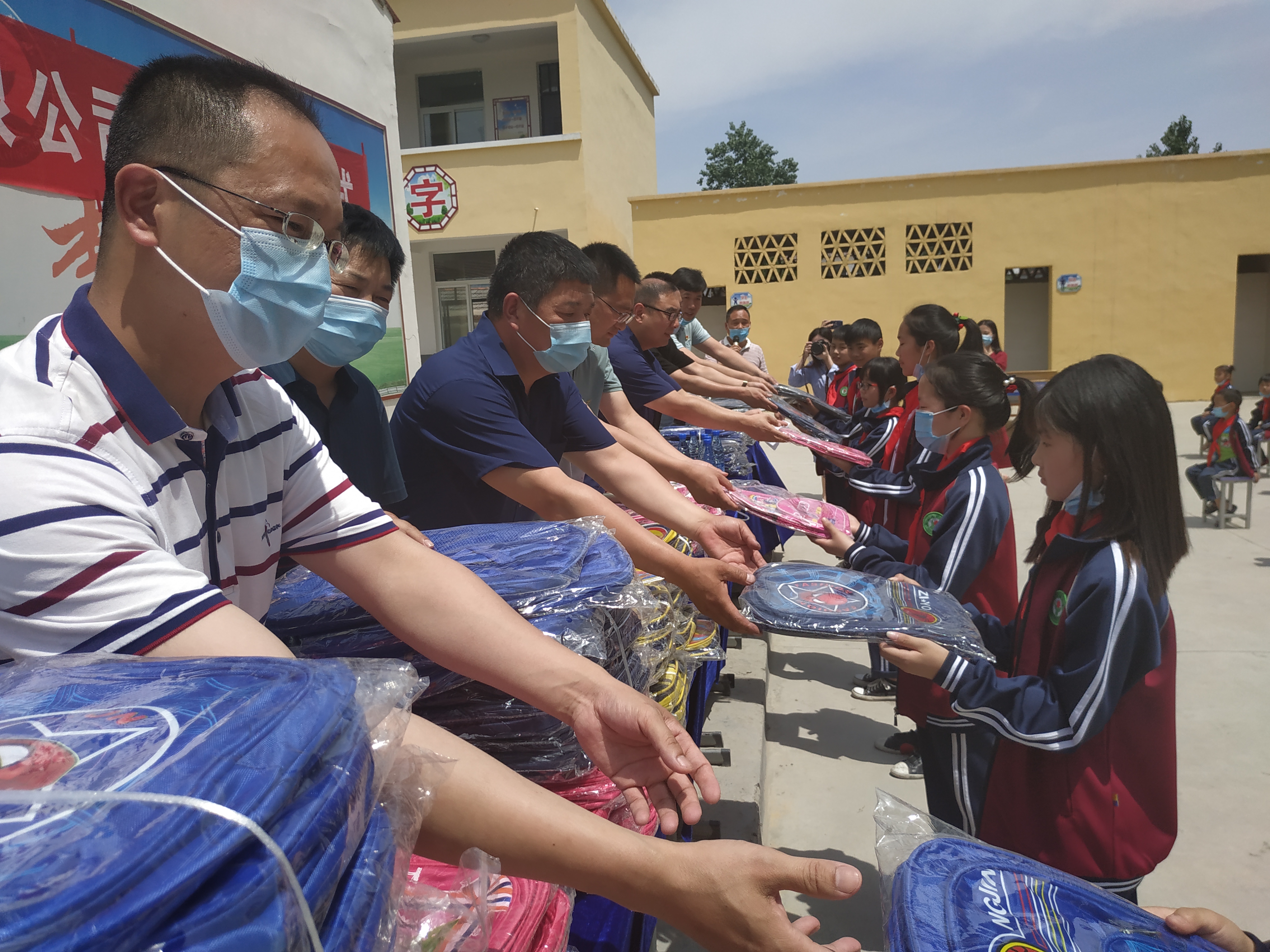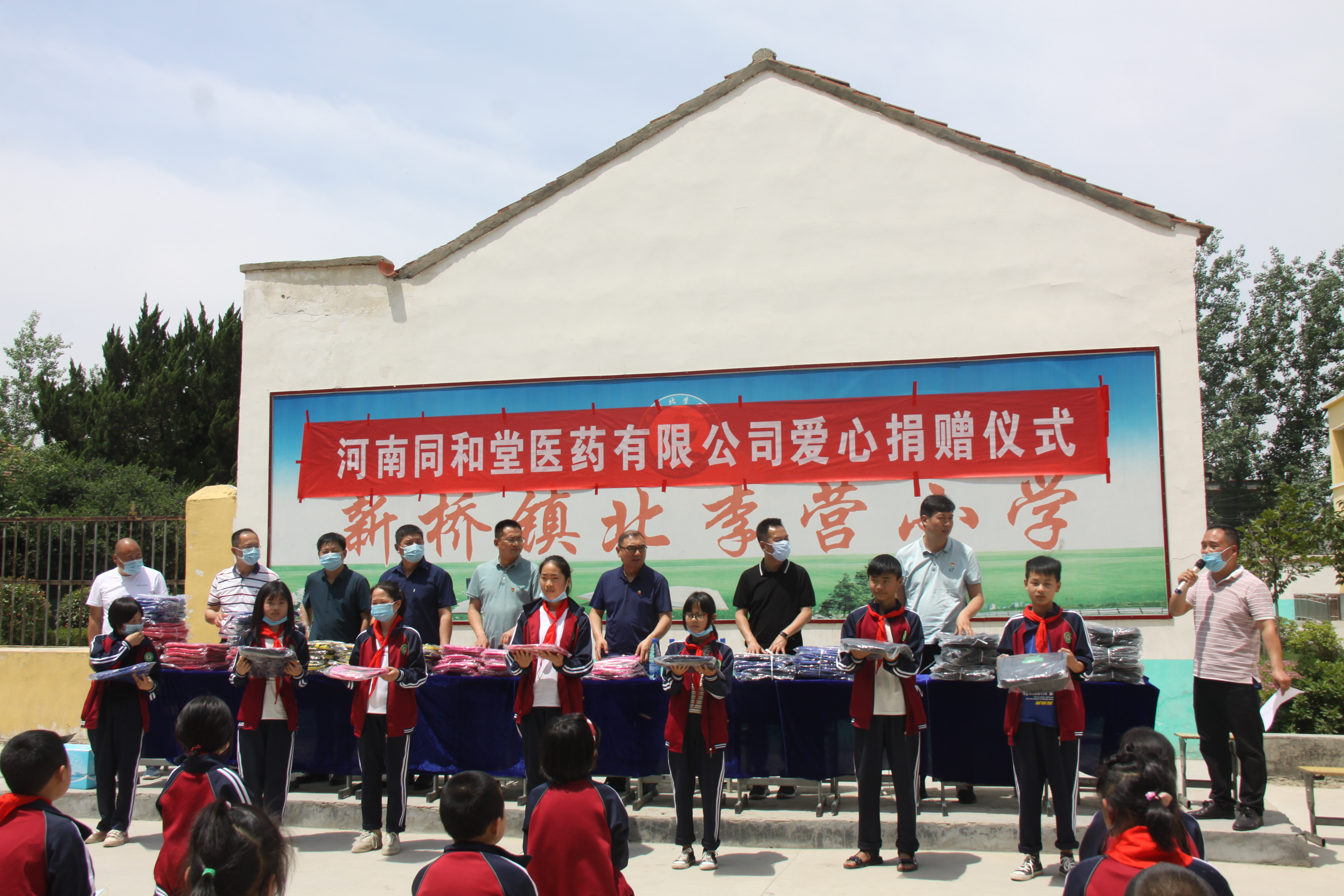 5月21日,河南同和堂医药有限公司与部分周口爱心人士,穿过滚滚麦浪,来到市医保局定点扶贫村——项城市新桥镇北李营行政村,为村小学的学生们送去200个书包,向他们提前送上六一儿童节的祝福。