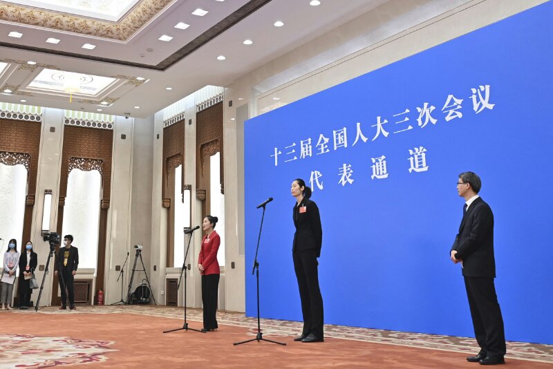 5月22日,第十三届全国人民代表大会第三次会议举行首场“代表通道”采访活动。这是全国人大代表朱婷(右二)通过网络视频方式接受采访。新华社记者 刘金海 摄