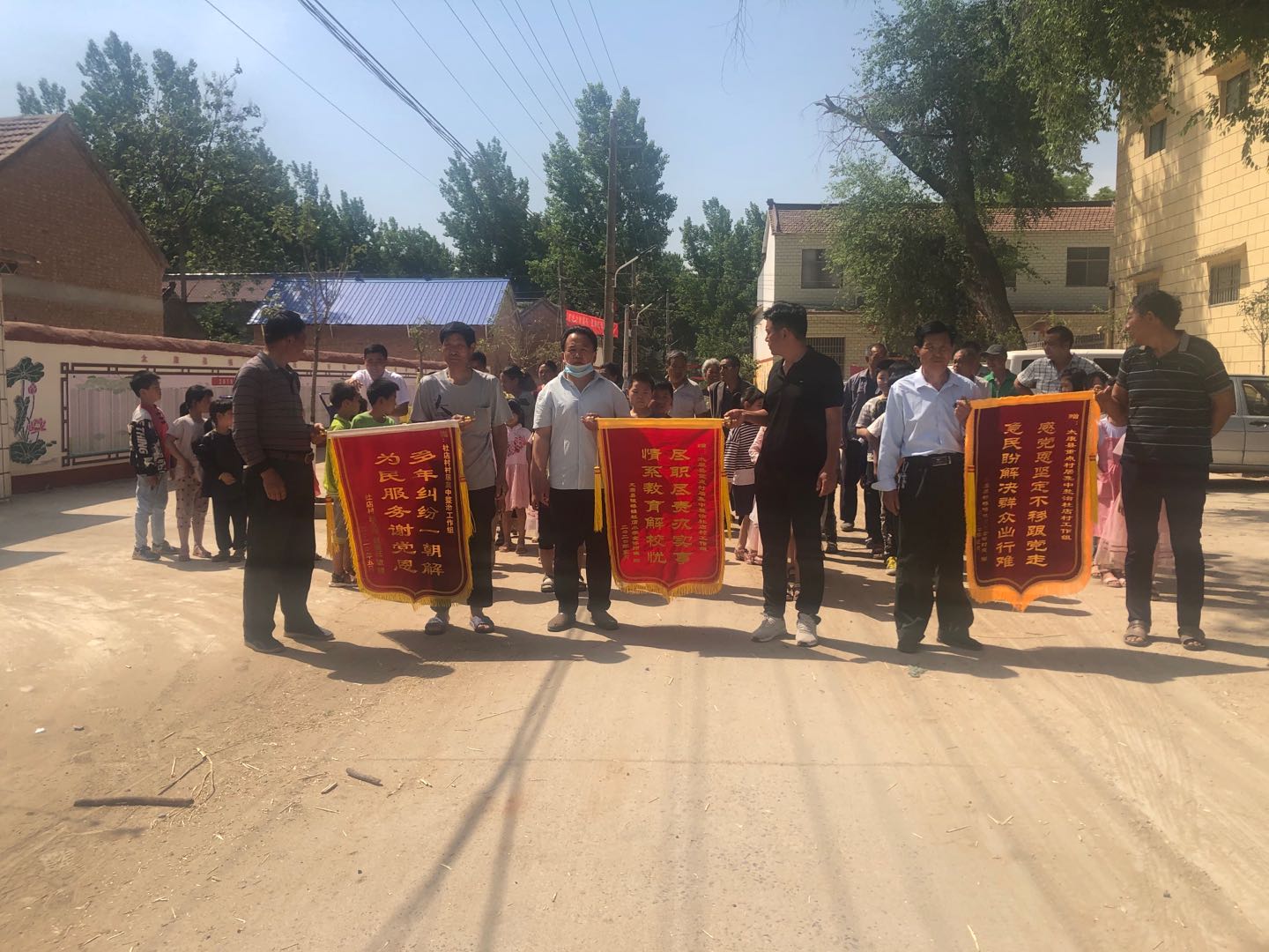 5月21日,板桥镇杜店村部分村民及师生代表将三面鲜红的锦旗送到太康县驻板桥镇杜店村集中整治工作组组长、县纪委常委刘春霞的手中,表达了对工作组自驻村以来提供帮助的感谢。