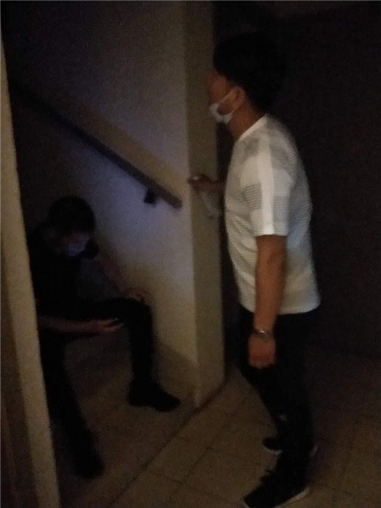按照事先摸排到的信息,抓捕组民警终于在南京市江宁区一小区内找到了嫌疑人的居住地,而嫌疑人却不在屋内。于是,民警们便在嫌疑人家门“守株待兔”,群里发来几张民警坐在楼梯口蹲守照片。等待是漫长的,一直等到晚上10时许,嫌疑人始终没有出现。民警通过嫌疑人门把手上几天前的一张广告单页判断,嫌疑人很有可能已经不在此居住,便撤离了蹲守点。