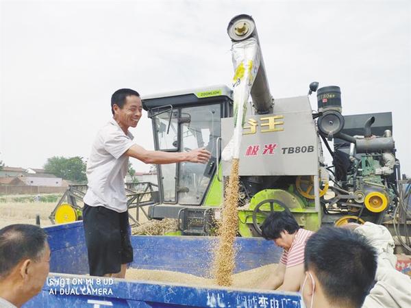 日前,我市小麦相继进入成熟期,田地里一片金黄,滚滚麦浪中收割机来回穿梭,农民已经开始收麦了。图为5月24日上午,沈丘县李老庄乡部分麦子开始收割,饱满的麦粒从收割机中流出,农民的脸上绽放出笑容。