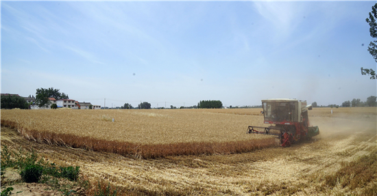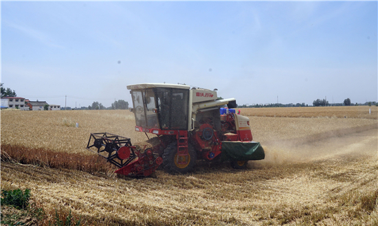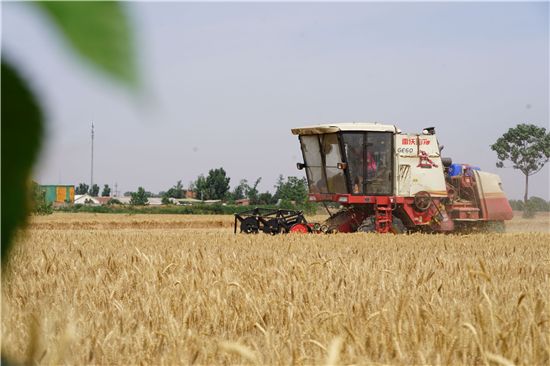 5月28日,在周口市西华县迟营乡前喜村,农民驾驶收割机在田间收割小麦。 眼下,周口市近千万亩小麦陆续开镰收割,当地农民抢抓农时收割小麦,确保颗粒归仓。 记者 金月全 摄