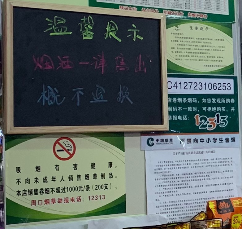 值得注意的是,近几年,电子烟使用率在青少年人群中呈明显上升趋势。青少年使用电子烟不仅会成瘾,还可能诱导他们去吸食传统烟草。今年21岁、在周口从事销售工作的小李称,他17岁时开始接触电子烟,那时觉得很酷,同宿舍的其他两名男生也抽。“那时候网上卖的电子烟包装得挺潮的,还有抹茶、荔枝、草莓等各种口味。”小李说,“现在网上买不到电子烟了,抽的普通卷烟,感觉更带劲儿。”记者走访了位于人民路上的某高中附近商店和超市,店家普遍反应售卖的没有电子烟,只有各类品牌的传统烟草。这些商店内都张贴着“吸烟有害健康”“不向未成年人销售烟草制品”等警示标识,但据商家说,“偶尔有看起来像学生模样的人买烟,不确定是不是附近学校的学生。”