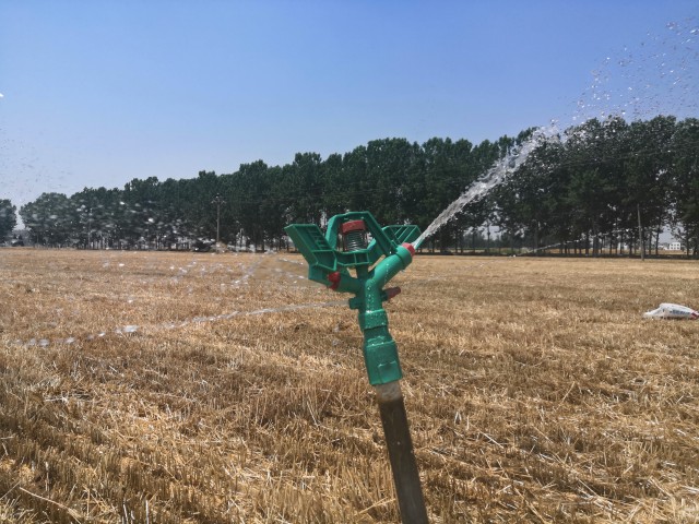 6月1日上午,西华县东夏亭镇仉庄村的一块田地里,村民展元厂正在浇水。麦子已经收完,夏种正当其时,但是目前土壤墒情不好,不浇水就没法播种。