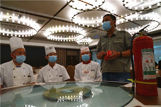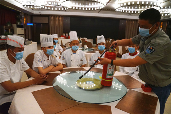 夏季来临,消防安全成为大家关注的焦点,为了消除隐患,防止安全事故发生,6月3日,周口饭店精心组织管理人员和员工开展消防应急演练,提升消防应急处置能力,预防各种事故发生。当天,来自该饭店餐饮部及客房部40余名工作人员参加了演练。(记者 金月全 摄)