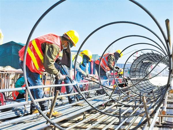 为加快贾鲁河大桥的施工进度,连日来的持续高温天气并未能阻碍周口北环建设者的激情。他们在野外接近40℃的高温下,依然奋战不止。图为贾鲁河大桥钢筋工正在施工作业。 记者杜洪亮 摄