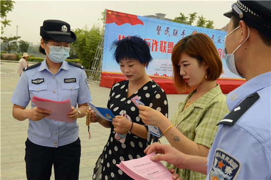 活动现场通过设置咨询台、摆放宣传展板、组织队伍巡游宣传等形式向社会各界普及防诈知识。