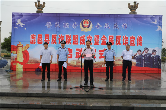 许四军主持仪式并宣布鹿邑县反诈联盟正式成立,全民反诈宣传活动正式启动。县委各部委、县直及驻鹿各单位分管综治副职,各乡镇(办事处、管委会)综治副书记,政法委各科室负责人,县法院各基层法庭庭长,检察院有关部室负责人,公安局全体班子成员、各科所队室负责人、全体驻村民警辅警,金融系统、电信运营商、教育系统、社会公益组织、志愿者、电商平台代表以及新闻媒体共计700余人参加活动。