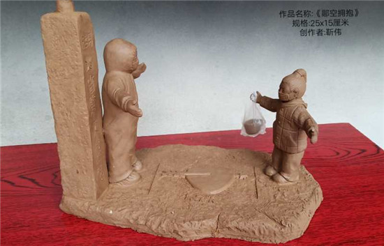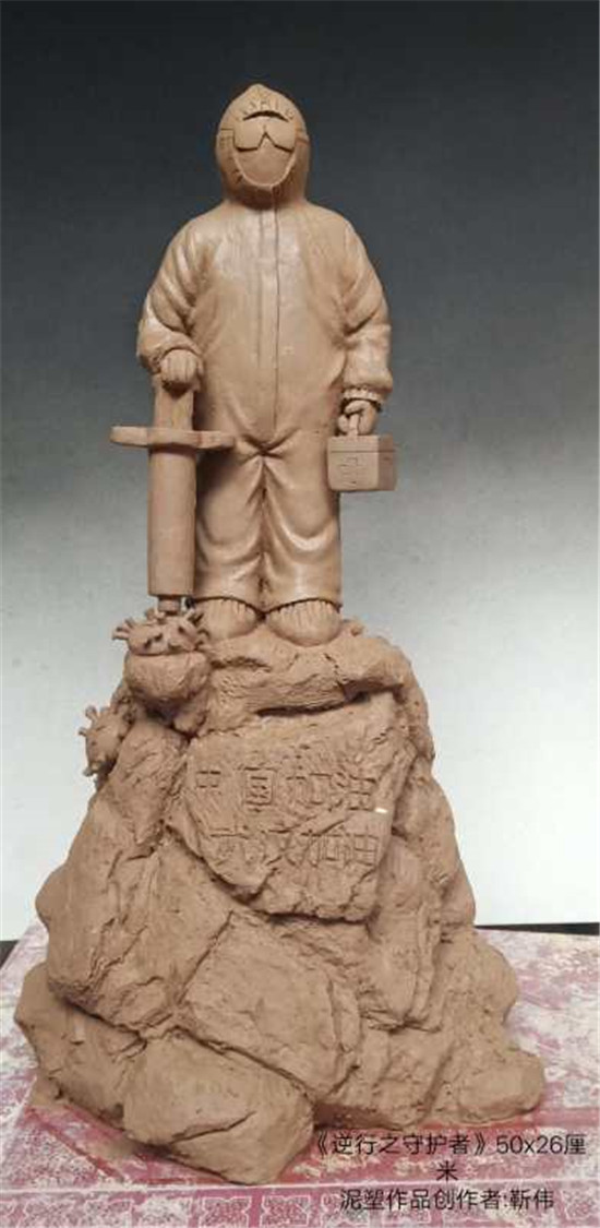 所捐《逆行之守护者》泥塑作品,高50厘米,宽26厘米,描述全副武装的医护工作者一手握针管杀死病毒,一手提药箱救人,讴歌了疫情中逆行的医护工作者不畏牺牲、与新冠病毒搏斗,冒死救治病毒感染者的伟大精神。《隔空拥抱》是讲述我市扶沟县人民医院抗疫故事,疫情期间奋战在抗疫一线的刘海燕医生和为自己送年夜饭的女孩隔空拥抱的感人场景,让无数人热泪盈眶。