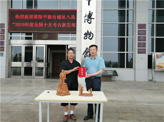 6月12日,在2020年“文化和自然遗产日”即将来临之际,淮阳区市级非物质文化传承人靳伟向市博物馆捐赠“抗疫”泥塑作品《逆行之守护者》《隔空拥抱》,以表达艺术家对新冠肺炎疫情期间全国医务人员无私精神的敬意。周建山馆长向靳伟颁发荣誉证书。