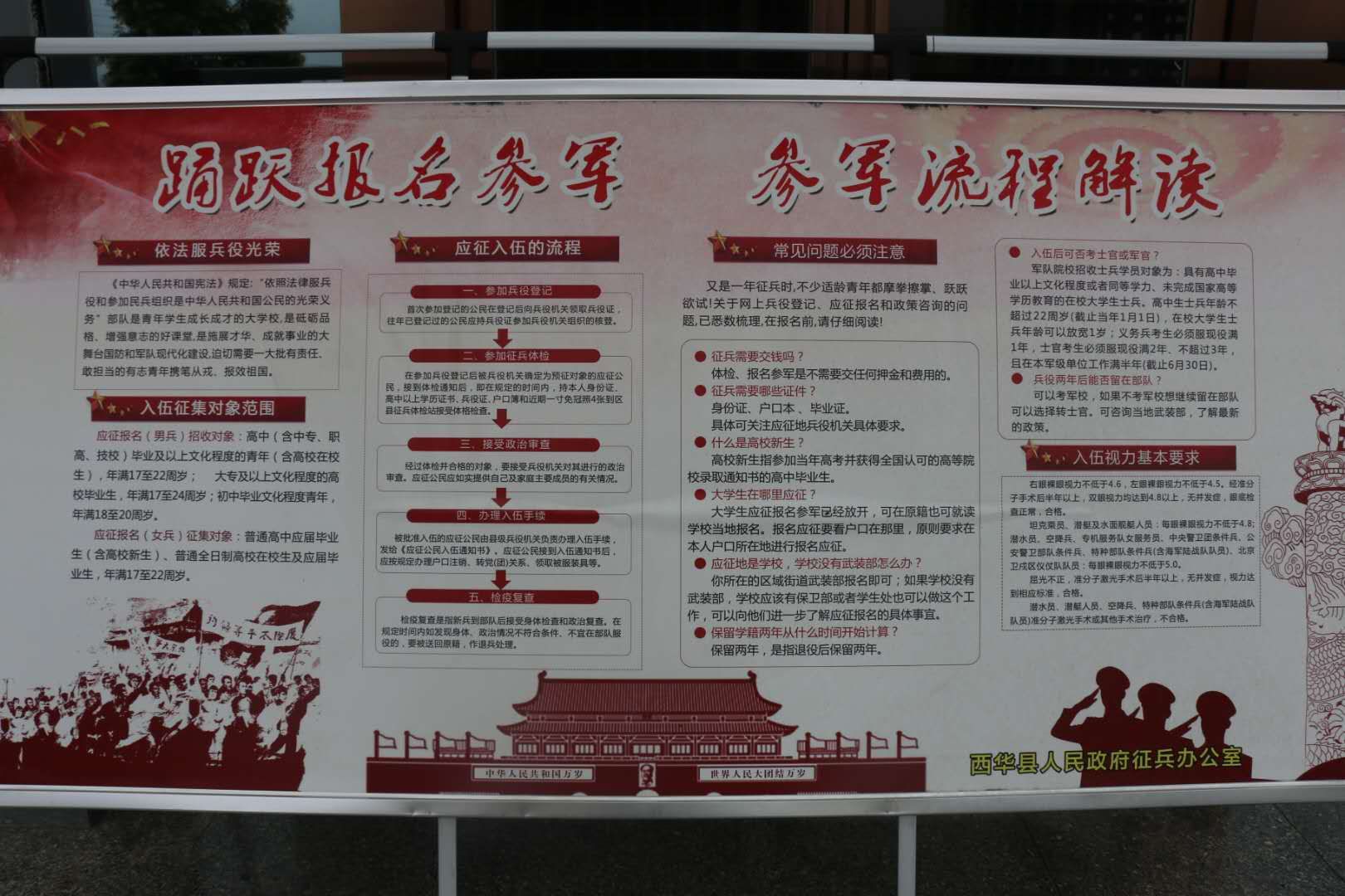 为做好大学生征兵工作,西华县人武部认真开展了多层次、全方位的宣传发动。县人武部多次召开党委会,分析大学生征兵形势,研究制定层层宣传发动方案。扎实开展大学生兵员潜力调查工作,挖掘大学生兵员潜力,及时登记造册。全县成立了60支由县人武部干部职工、乡镇专武干部、村民兵干部参加的大学生征兵宣传小分队,分头对辖区内在家的各级各类院校毕业生和在校生,进行挨家挨户、面对面的宣传,把《2020年西华县大学生征兵宣传册》发放到每一名大学生手中,做到一人不漏。为其算好“经济帐”、“ 政治帐”、“ 前途帐”。把针对大学生青年制定的最新调整的优惠政策宣传到位,最大限度发掘大学生征集潜力。同时,该县把做深做细大学生征兵宣传报名工作,作为完成征兵任务的重要基础,积极转变思路,创新工作方法,灵活运用各种宣传手段,千方百计增强宣传发动的针对性、实效性。该部除采取散发传单、悬挂横幅、制作板报、张贴标语、现场咨询等传统方式外,还充分利用广播、电视、微信、短信、电子屏等传媒手段增强宣传效果,做到广播电视里有音有像,微信短信电子屏有征兵信息滚动发布,墙报上有文,横幅标语上有宣传口号,提高全民政治意识和国防观念,切实让大学生入伍优惠政策宣传不留死角。该部充分利用对现役军人家庭逐户走访解难、赠送悬挂“光荣军属”牌匾、敲锣打鼓送喜报等活动,在全社会大力营造“一人参军、全家光荣”的鲜明导向,让尊崇军人的号召在西华县落地,让当兵光荣的传统在群众心中扎根,从而激励大学生青年积极报名参军的报国热情。