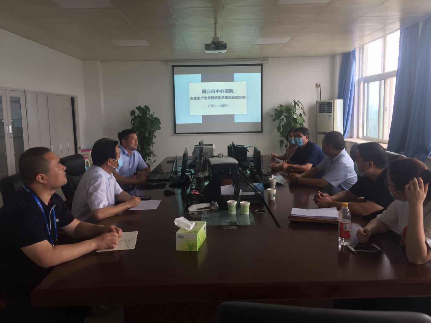 6月15日下午,扶沟县人民医院一行6人来到周口市中心医院对安全生产双重预防体系建设工作进行参观交流,市中心医院副院长吕燕平、保卫科科长刘献华、医联部主任张小虎陪同。