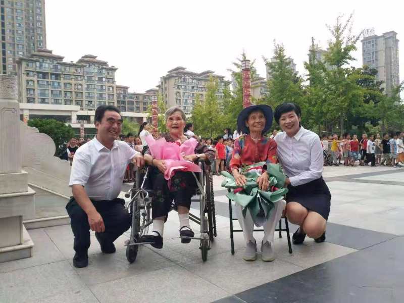 李纪龙把退休老教师请回学校,接受年轻教师的致敬。