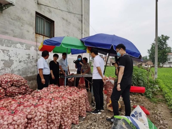 今年以来,受疫情影响,王店乡刘庄村大蒜丰收后面临销售难题和价格损失。为加强驻村帮扶实效,淮阳区市场监管局驻王店刘庄工作队积极联系爱心企业,帮助群众解决销售难题。贾飞邀请周口建业地产团队到刘庄走访农户,向他们详细介绍了刘庄村大蒜收成、品质及销售情况。