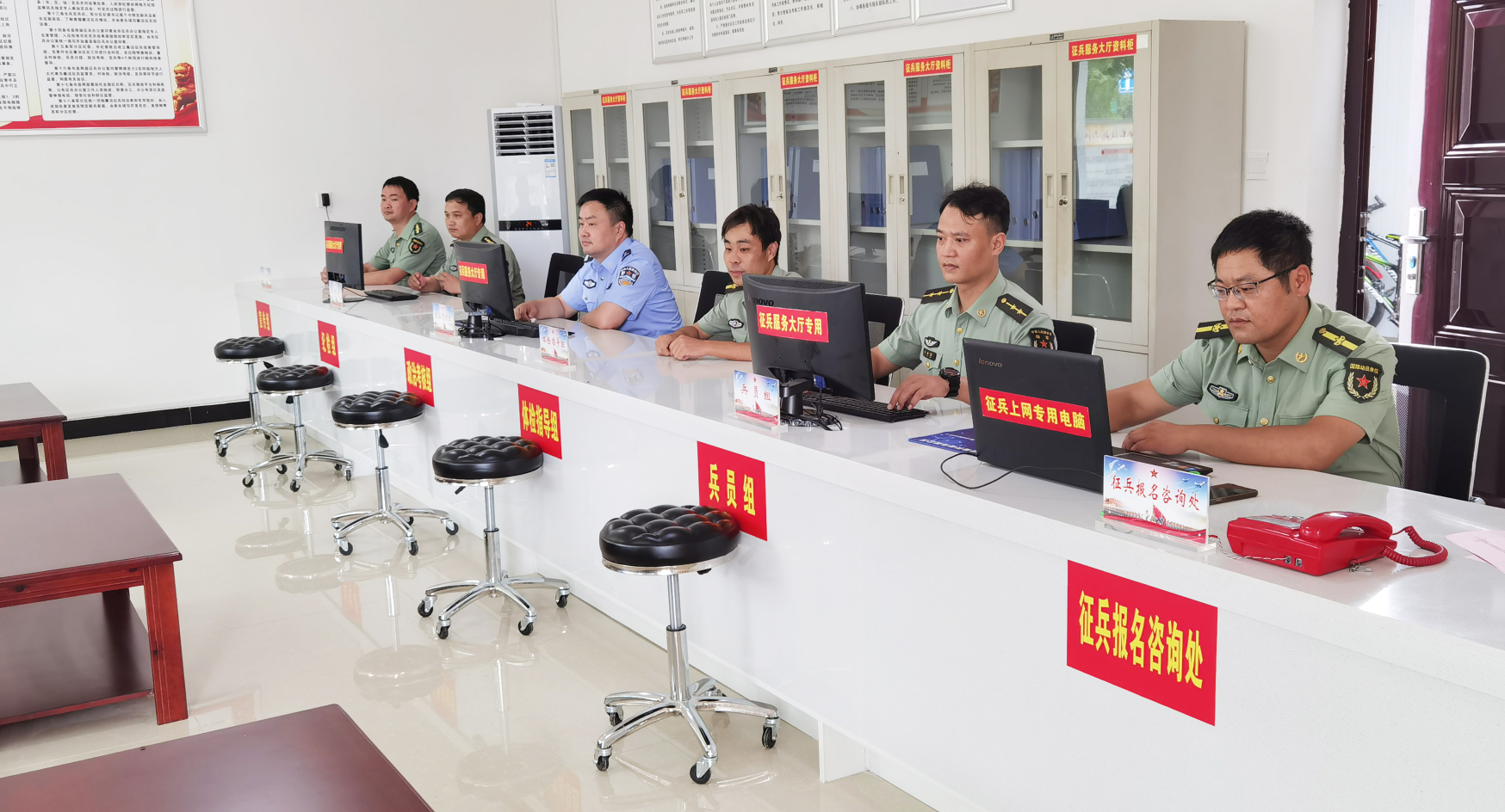 据了解,征兵服务大厅内共设有征兵报名咨询处、兵员组、体检指导组、政治考核组、纪检组、宣传组等6个服务席位,并附有21个镇(街道)武装部联系方式和征兵工作领导小组电话以及廉洁征兵咨询举报电话。这里不仅仅是集中办公的场所,更重要的是简化和省略适龄青年报名应征过程中的若干环节,从源头上堵塞“漏洞”,让程序更透明,让渠道更顺畅,让效率更高能。