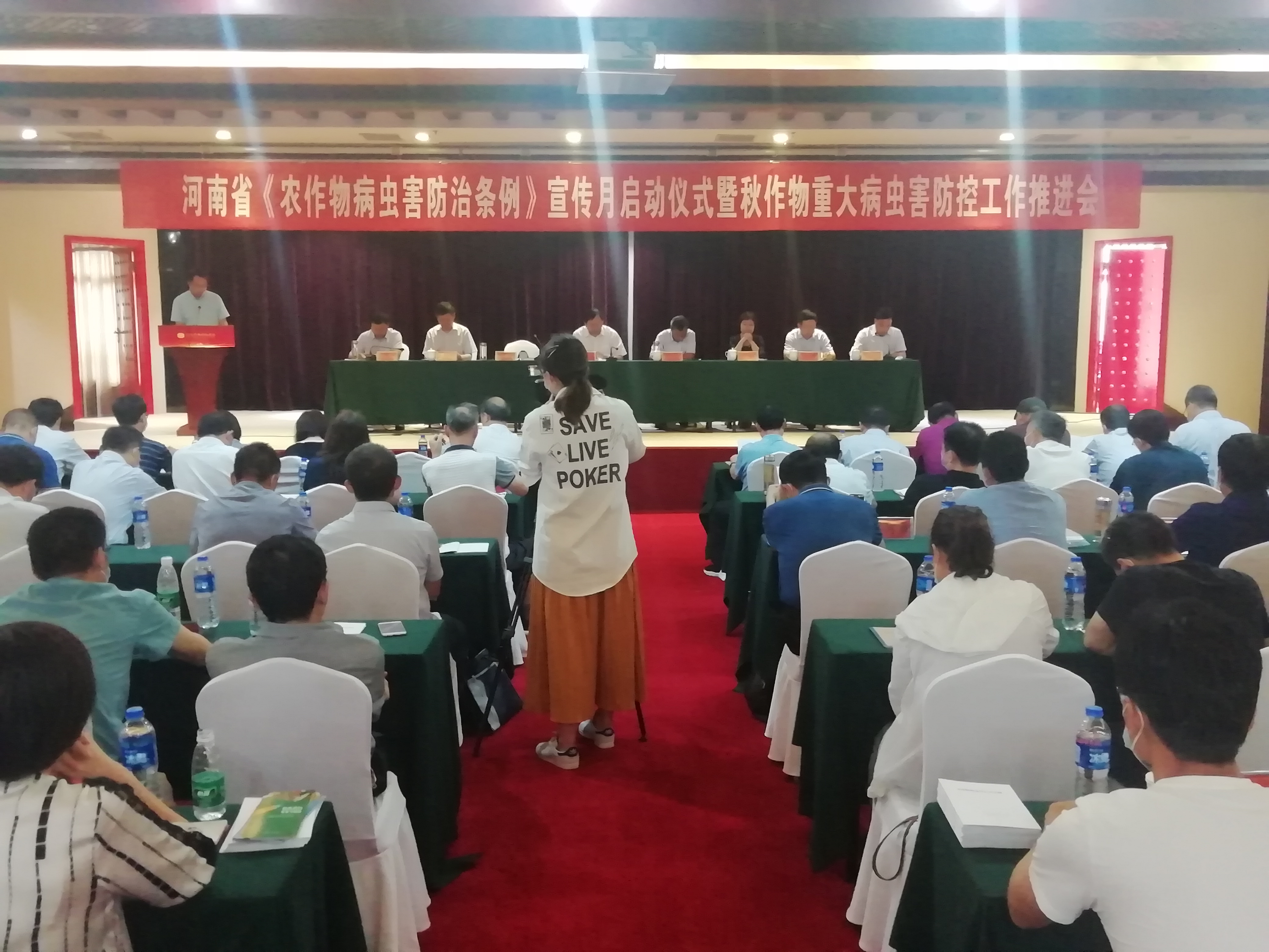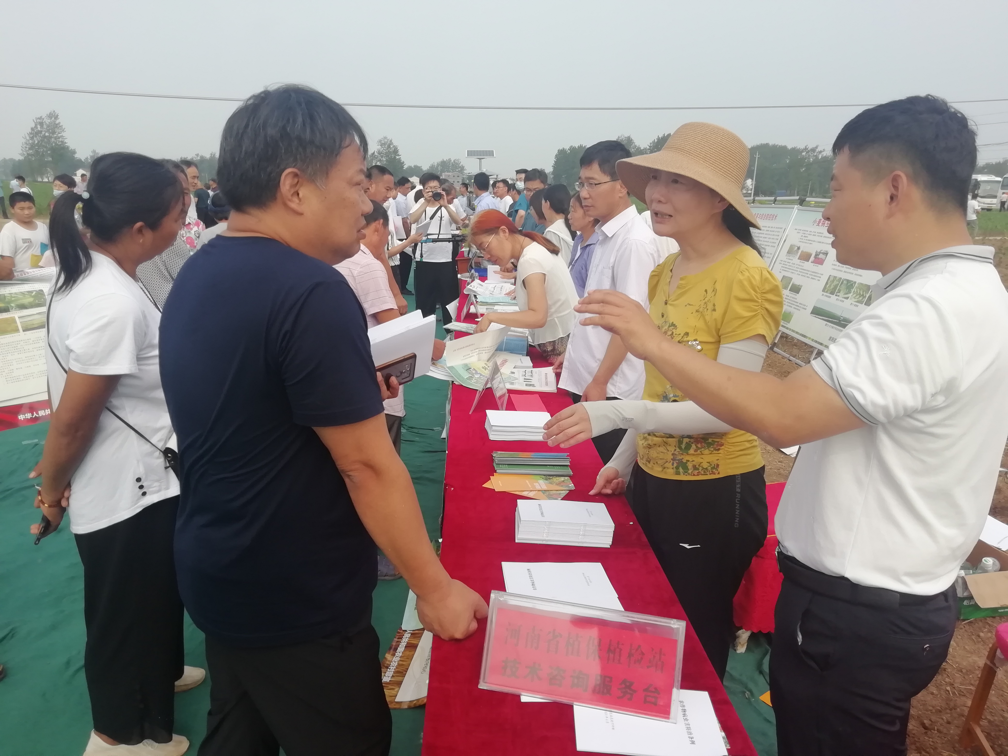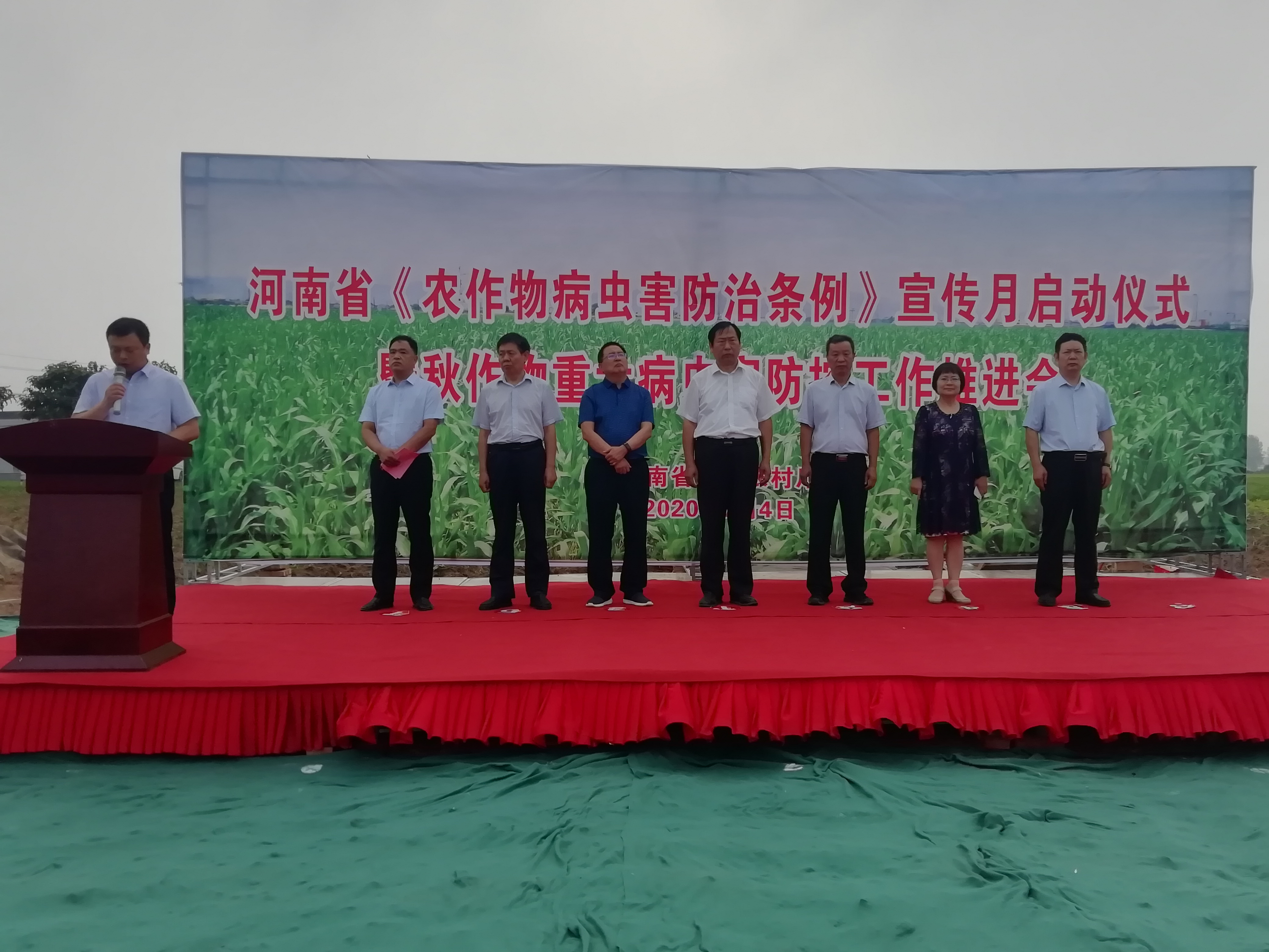 会前,我省《农作物病虫害防治条例》宣传月启动仪式在淮阳大连乡龚桥村举行。省植保植检站工作人员向现场群众宣讲了秋作物病虫害防治技术,发放了《农作物病虫害防治条例》、《草地贪夜蛾防治挂册》等资料,与会人员观摩了淮阳统防统治玉米病虫害情况。