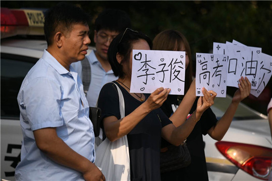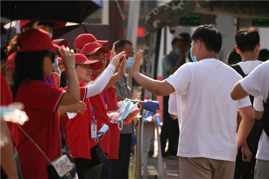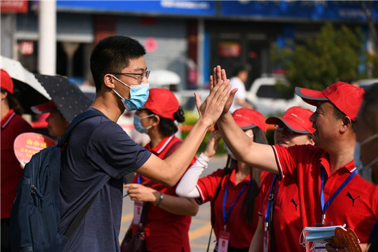祝愿学子们考出好成绩,今夏实现金榜题名,是全社会共同的心声。7月7日上午8点多,2020年高考开启神圣时刻,和往年不同的是,因疫情影响,学子们带着口罩入场,作为外援的家长们,更是悉数赶到考场外,为孩子们加油!而辛勤一年的老师们,更顾不上歇一会儿,也赶到考场外,为学生击掌打气,构成周口考场外动人的图景。图为市一高考场外的家长们举着加油的牌子,为孩子助威!一高的老师穿上小红马甲,当志愿者,和进场的学生击掌助威!